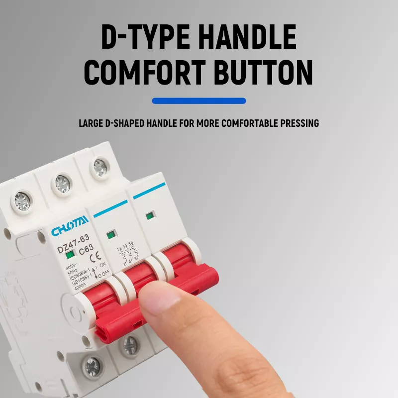 Eton Electric is a professional manufacturer of miniature circuit breakers. Our DZ47-63 series 3P 63A DZ47 Miniature Circuit Breaker is a DIN rail-mounted protection device featuring a flame-retardant thermosetting shell, ergonomic D-type handle, and visual status indicator. With 4000A breaking capacity, overload & short circuit protection, and wide temperature adaptability (-35°C to 70°C), it provides reliable power safety for residential, commercial, and industrial power distribution systems. We offer complete specifications, certified quality, and OEM/ODM support to deliver stable, safe circuit protection solutions for global customers.