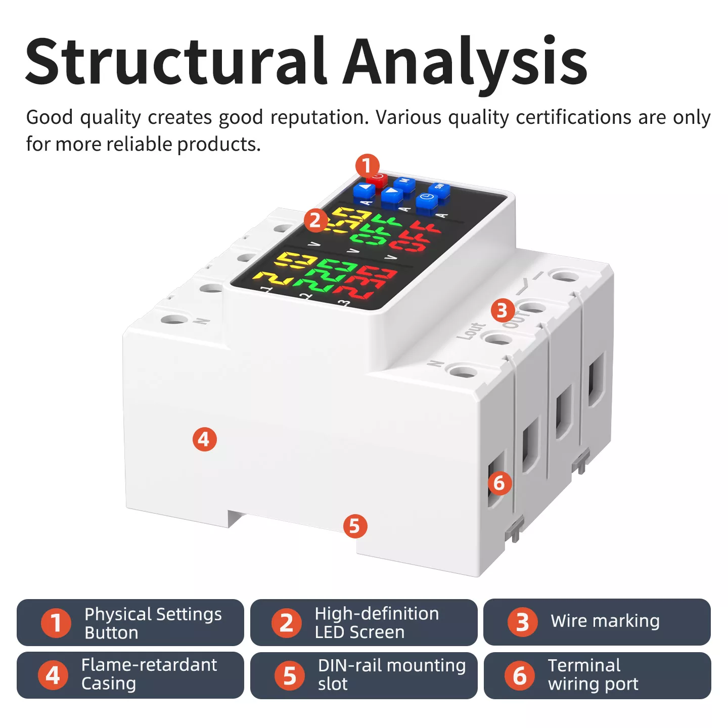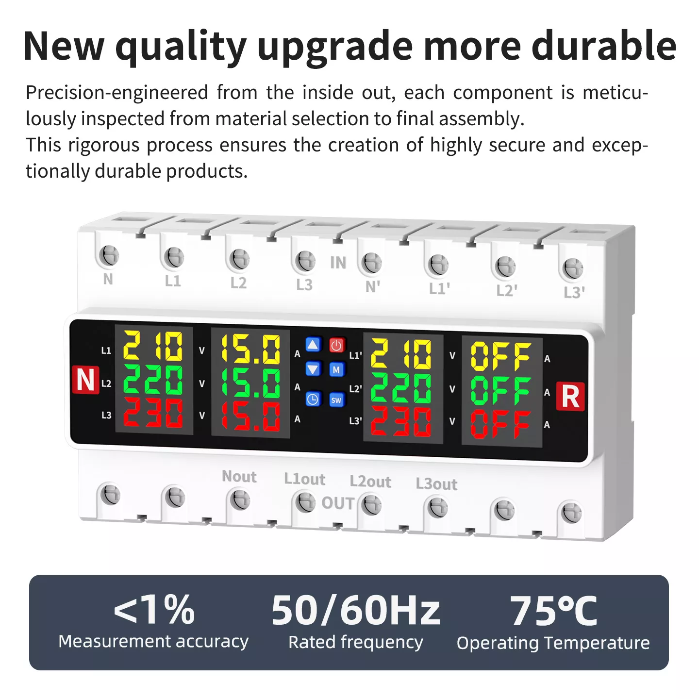 Our 4P/8P Over and Under Voltage Protector uses high-conductivity copper terminals, ensuring strong current carrying