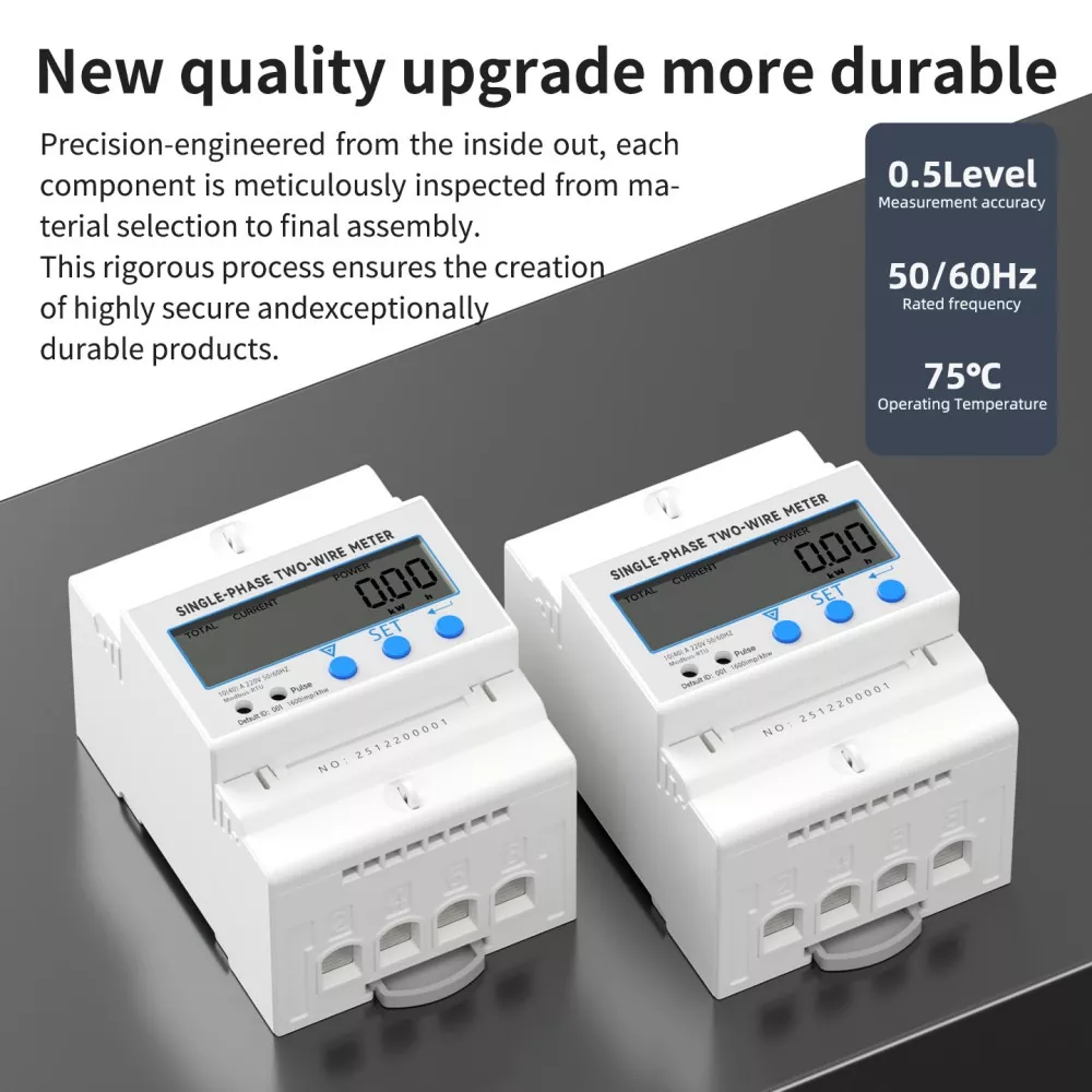 Eton Single phase Two wire Meter is a high-performance energy metering instrument for single-phase power systems. Precision-engineered from inside out, each component is inspected from material selection to final assembly, ensuring secure and durable performance. It integrates SMT chip technology to realize accurate active energy metering, supports forward/reverse electricity calculation, and requires no long-term debugging. With DIN35mm standard rail installation and high-current copper terminals, it’s easy to wire and stable to use.