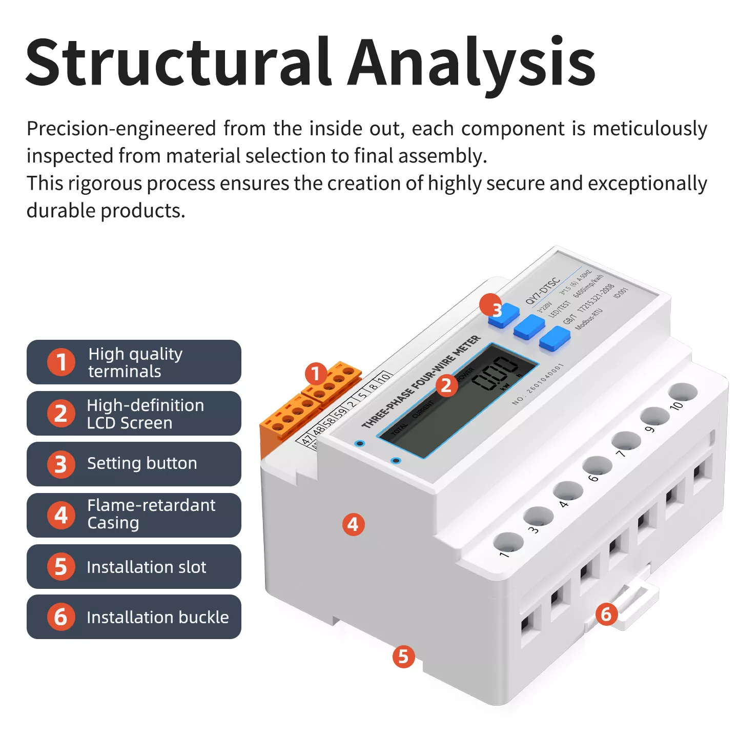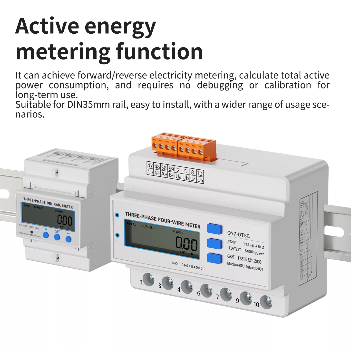 The meter is suitable for DIN35mm standard guide rail, with easy installation and disassembly, no need for complicated tools. The "top in, bottom out" wiring method is clear and intuitive, with clear terminal marking, which can effectively avoid wrong wiring. The high current copper terminals are firm and reliable, not easy to loose under long term vibration, ensuring safe and stable operation. It can achieve forward/reverse electricity metering, calculate total active power consumption, and requires no debugging or calibration for long term use.