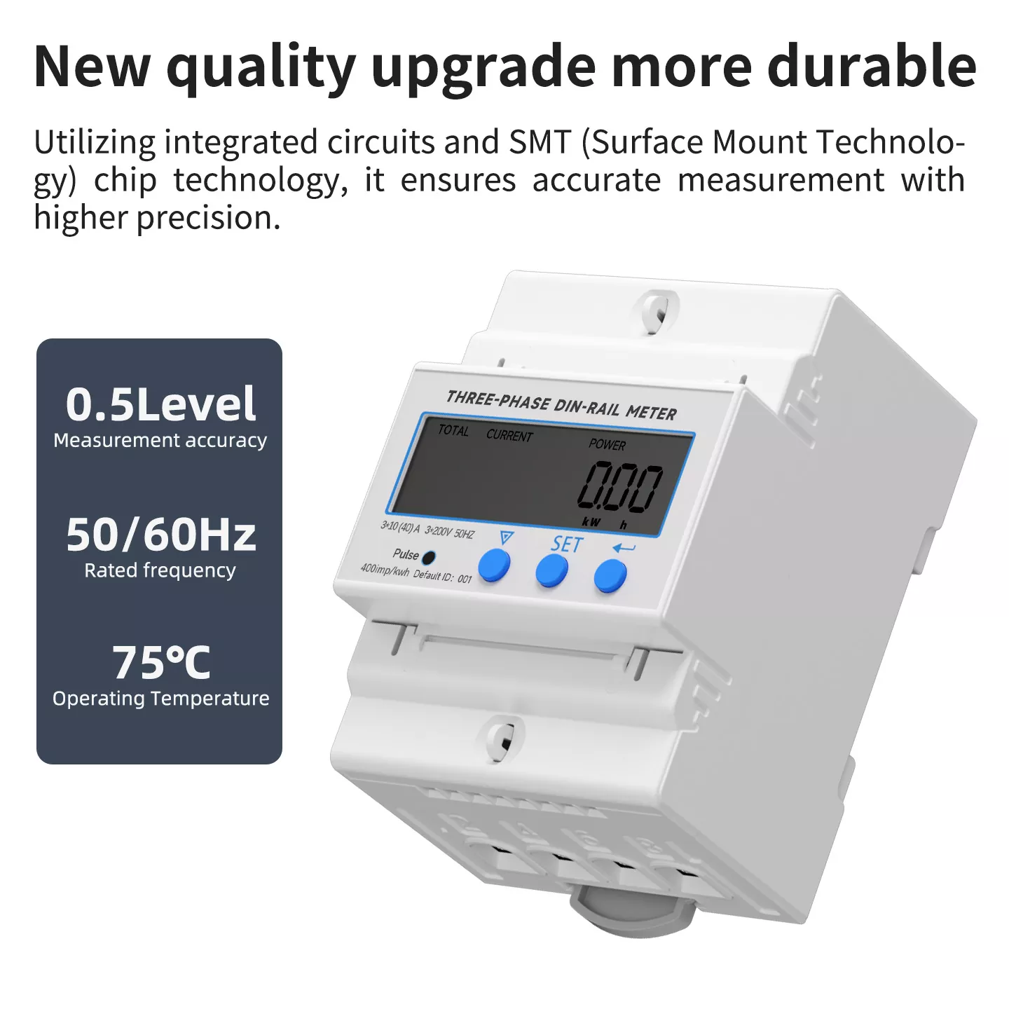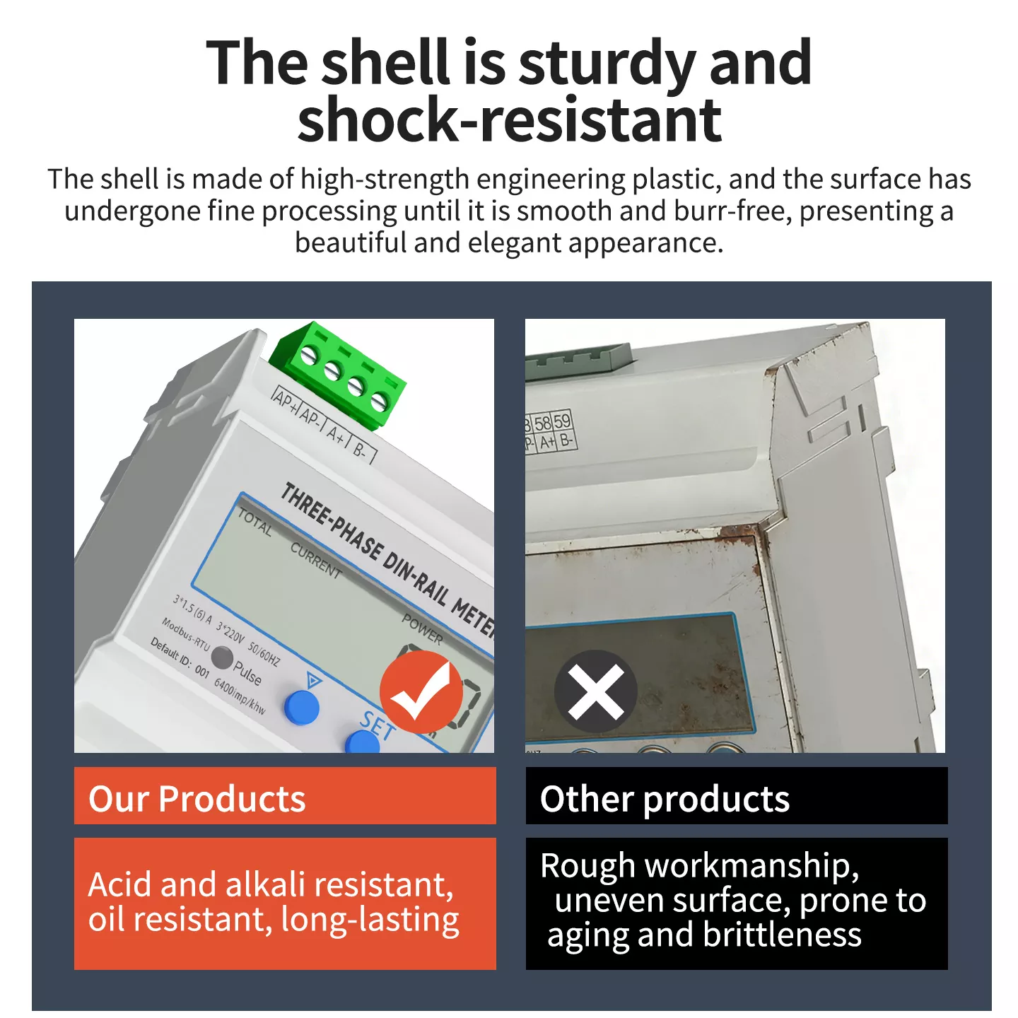 Our three phase DIN rail meter has undergone a full quality upgrade. We utilize integrated circuits and SMT chip technology to ensure higher measurement precision and stability. The shell is made of high strength flame retardant ABS material, which is acid and alkali resistant, oil resistant, anti aging and shockproof. Each product undergoes strict aging test, accuracy calibration and withstand voltage test before leaving the factory. It can operate stably for a long time in harsh industrial environments, with stronger safety performance and longer service life.