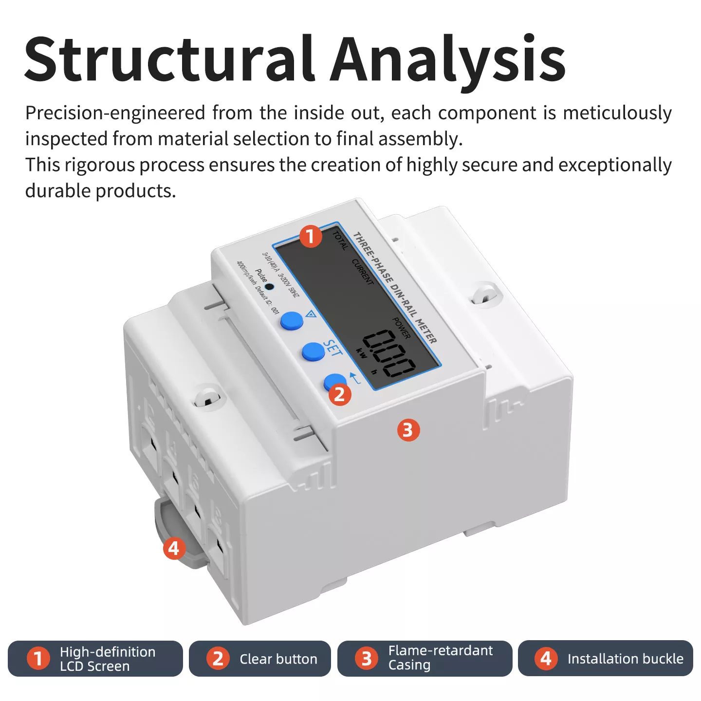 The Three phase DIN rail Meter features a scientifically optimized structural design, with four core components working in harmony: