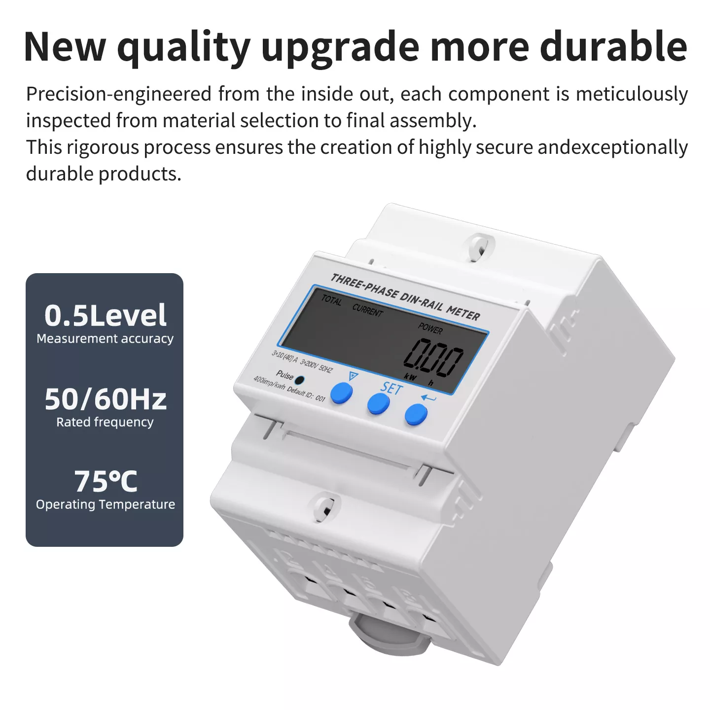 Our Three phase DIN rail Meter has undergone a comprehensive quality upgrade. Precision engineered from the inside out, each component is meticulously inspected—from high quality raw material selection and precision processing to SMT chip welding and final assembly. This rigorous production process, combined with aging testing, eliminates potential quality risks. The result is a product that is highly secure, corrosion resistant, and exceptionally durable, capable of long term stable operation even in harsh industrial environments with short term operating temperatures up to 75°C.