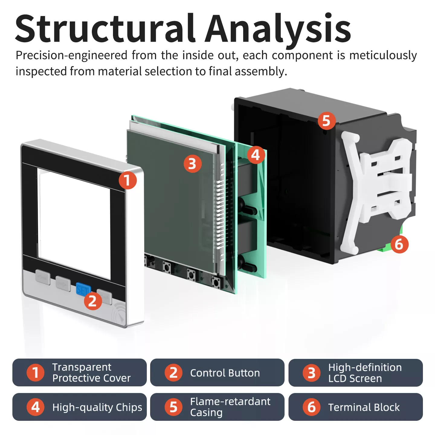 The voltmeter adopts a compact and scientific structure, including 6 core components: