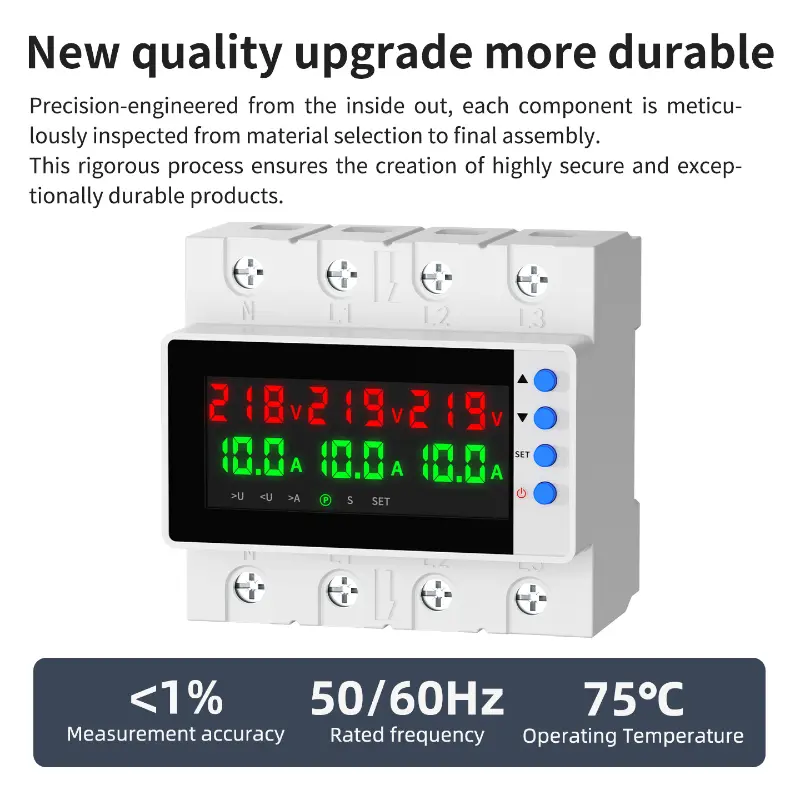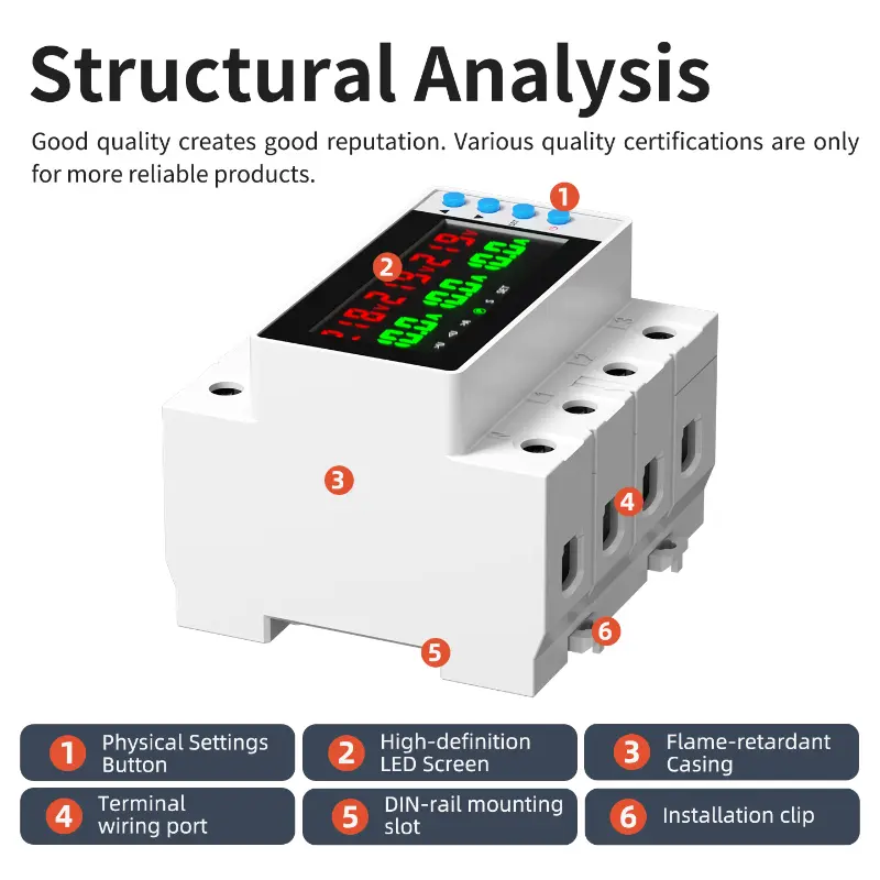 Our Voltage and Current protector adopts standard DIN rail installation, compact structure and small space occupation. 4P/8P Over and Under Voltage Protector is suitable for multi-circuit centralized protection, with quick wiring and simple operation, which greatly reduces installation and maintenance difficulty.